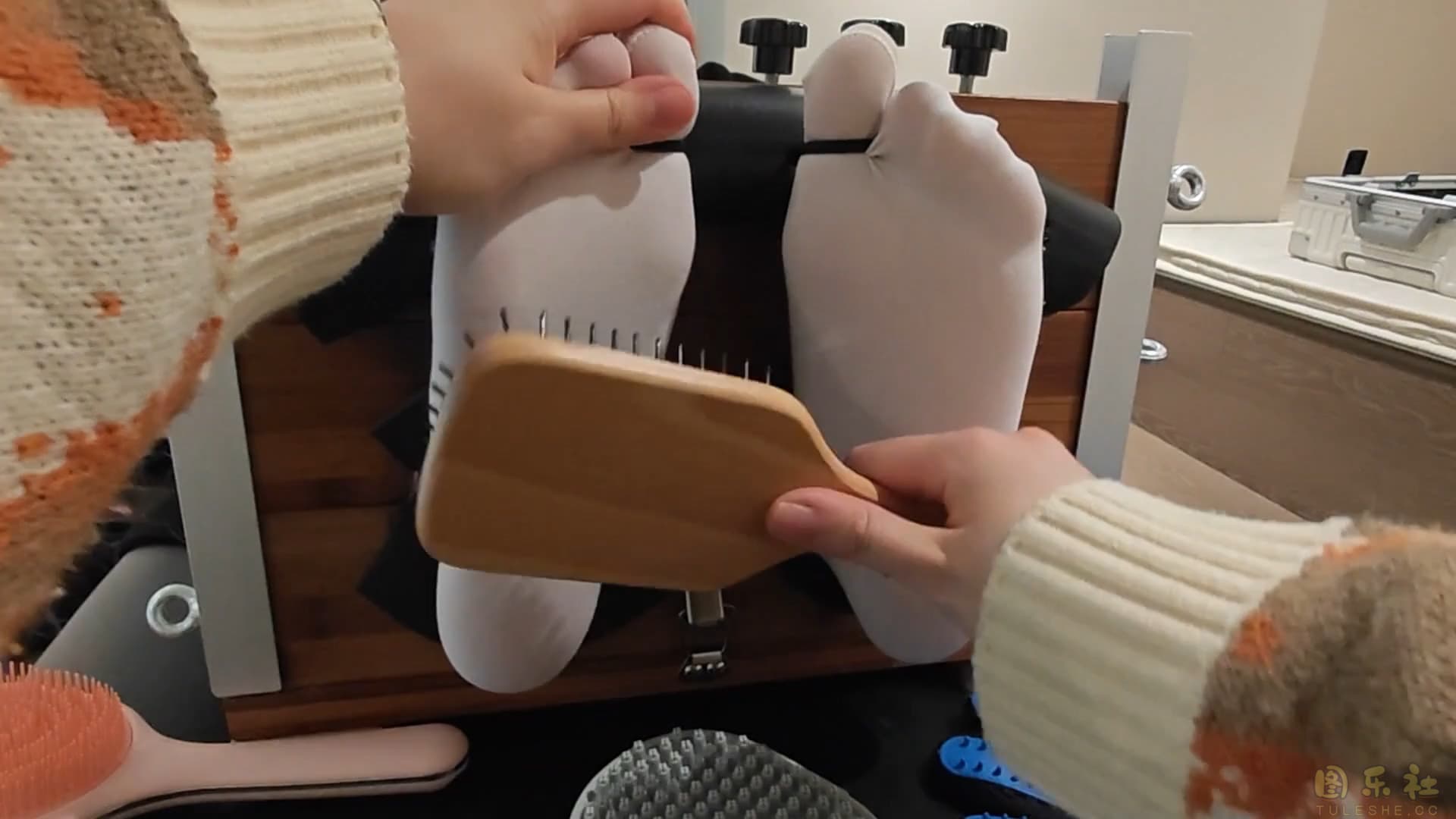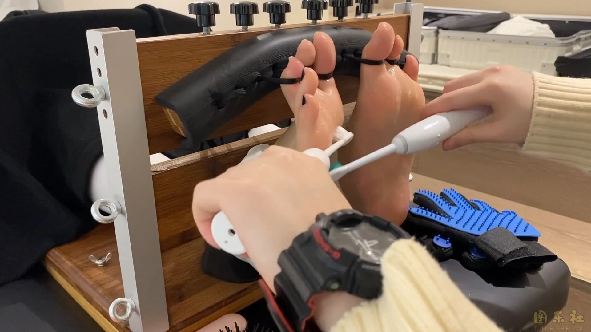 小野又来体验足疗了,十个脚趾全固定,电动牙刷气垫梳 撸猫手套齐上,痒到各种喊叫。防止乱动最后来了全包拘束,固定四个按摩仪在脚底,倒满润滑剂,封闭感官放置出门,最后回来小野以为要解放之时再来个疯狂刷脚,直接痒到哭出来。